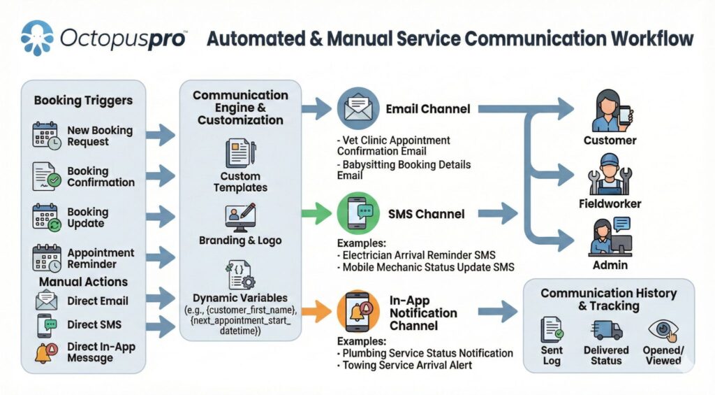 Keep everyone aligned, make communication easier to track, and reduce delays caused by scattered messages. With two-way booking communication and direct messaging with technicians through OctopusPro, your team can contact customers, contact fieldworkers, send updates, request approvals, answer questions, and keep chat, SMS, calls, and communication history linked to the relevant job record instead of scattered across personal devices.